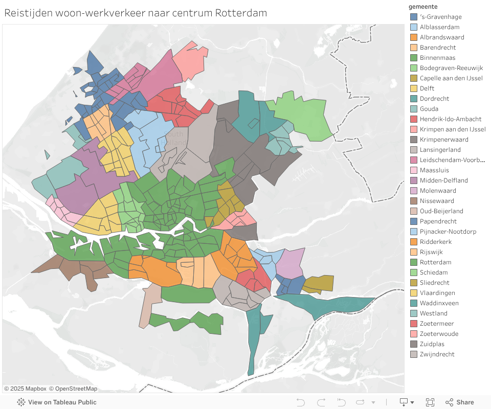 Dagelijks veranderen de afstanden en reistijden van woon-werkverkeer van medewerkers. Door tijdelijke afsluitingen, nieuwe snelwegen of de opening van een nieuwe bedrijfslocatie. Wat zijn hiervan de effecten? Waar wonen uw medewerkers? Mobiliteitsdata kan op veel manieren worden weergegeven. De volgende visualisaties tonen enkele voorbeelden van Rotterdam e.o.