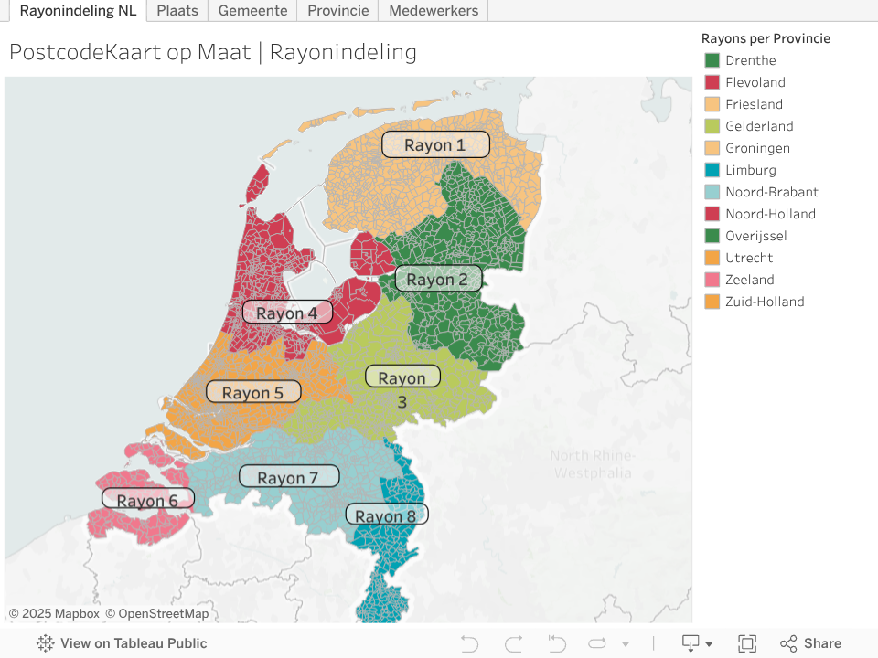 Op deze wijze kunnen wij ook uw rayons en locaties visualiseren op een PostcodeKaart op Maat. Inclusief uw medewerkers per rayon/postcodevlak. Om te starten sturen wij u een Excel lijst met de 4072 postcodegebieden in Nederland. U voegt naar wens enkele kolommen toe, vult deze met uw bedrijfsinformatie en wij doen de rest.